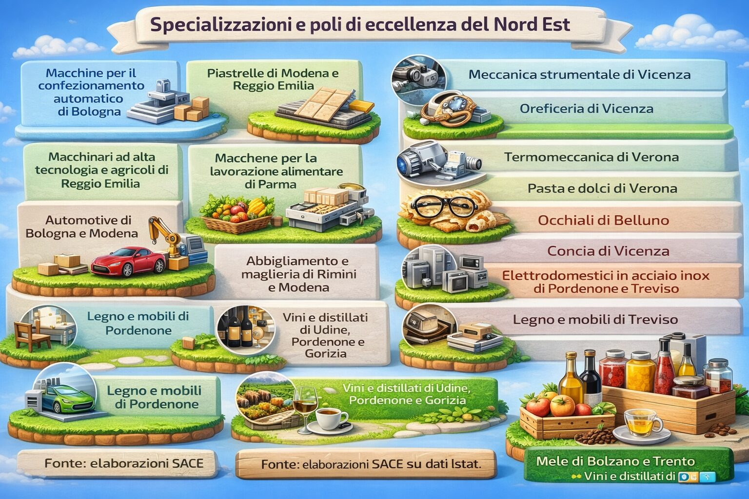 Quello che rende grande una regione e un’area economica sono le tante eccellenze territoriali riconosciute in tutto il mondo. Ciascuna regione del Nord Est ha le sue peculiarità che si riflettono in svariati prodotti di alta qualità. Queste specializzazioni sono il risultato di storie di successo che vanno oltre la singola impresa, nate dalla condivisione di risorse, competenze e innovazioni.